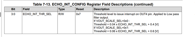 TUSS4470TRTJR 中的ECHO_INT_CONFIG Register (Address = 0x17)如何查找ECHO_INT_THR_SEL的值,OUT4要不就是乱跳要不就是没反应,请问下要如何找到正确的值呢。