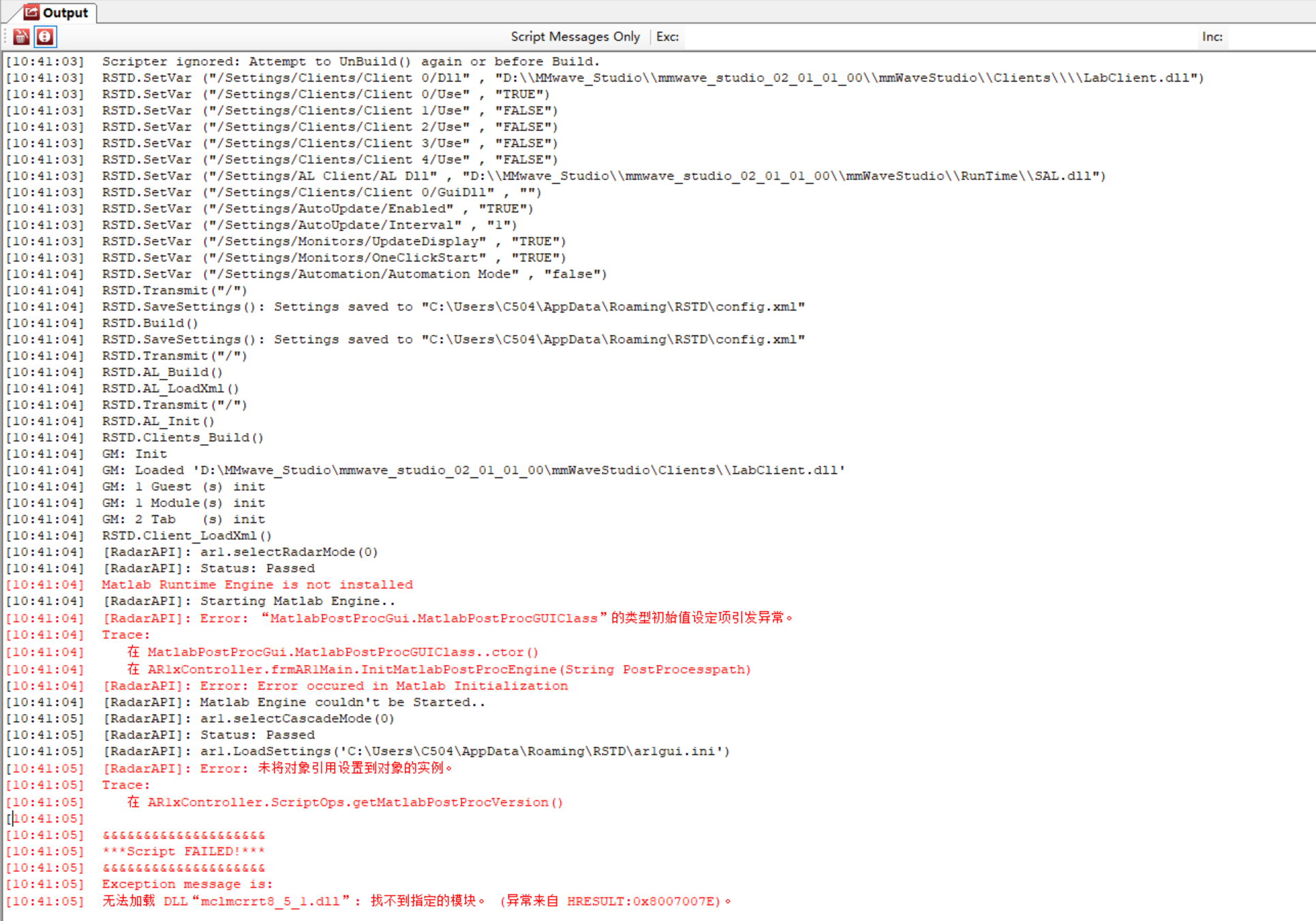 报错信息是“MATLAB Runtime Engine is not installed”,请参考mmwave_studio_user_guide.pdf “2.1 Installation” 安装32 bit Matlab Runtime Engine (Version 8.5.1)。