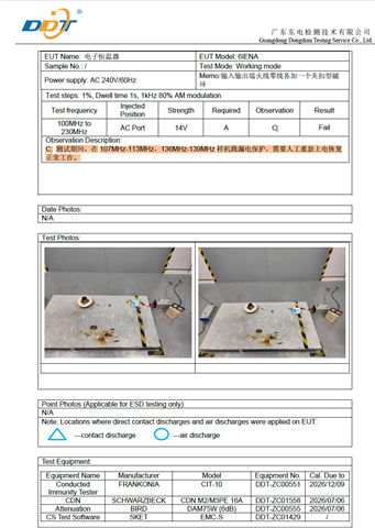 - Test strength 14V: GFCI ground fault at 106~117MHz,123~136MHz,148~169MHz,227MHZ