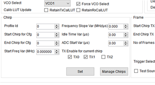 在mmwave studio中可以同时去配置awr2243的三个天线的发射不同的相位,我现在想让三个天线发射不同初始频率的线性调频波,是通过改变上图中Chirp 中的start Freq Var(MHZ)吗