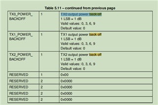 当前支持的最大发射功率为13dBm,最小的发射功率可以到多少呢?看mmWave-Radar-Interface-Control.pdf里面关于TX output power back off有如下说明,最小支持的发射功率为13-9=4dBm吗?这个TX output power back off支持的功率衰减具体范围和步进是多少呢,还是只有0、3、6、9几个选择可配置?