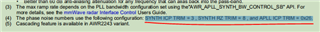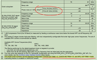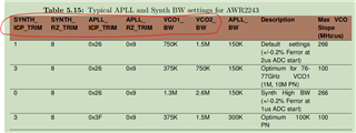 由于锁相环环路带宽的配置直接影响到Chirp信号的相噪、线性度、支持的斜率等,想咨询下锁相环的寄存器配置,在AWR2243 Datasheet中有说明最大斜率266MHz/us是在如下图1(mmWave-Radar-Interface-Control.pdf)的环路配置下得到的,请问这个锁相环环路带宽可支持的配置范围是多少,只有图中的150KHz和300KHz可选吗,这个寄存器可以通过mmWaveLink或者其他的方法去配置验证不同的环路带宽配置下,相应的相噪、Chirp线性度等性能吗?我看2243Datasheet里面相噪的指标也是在一定的环路寄存器配置下得到的(SYNTH ICP TRIM = 3 , SYNTH RZ TRIM = 8 , and APLL ICP TRIM = 0x26.),也即图1表5.15中所示100MHz/us的斜率、150KHz的环路带宽下的指标,不同的参数配置对应的相噪、线性度指标是不同的,所以想知道如何配置选择合适的锁相环环路配置以达到最优的射频性能?