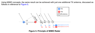 如图,因为想做MIMO,所以需要计算虚拟RX的合成孔径长度,已知两TX的间隔是4d,两RX的间隔是d,(d=1/2×lamda)那右边(红色的)TX与RX之间的距离是多少?