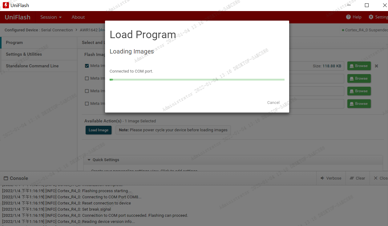 如下图所示,我们的产品在使用AWR1642 SOC开发,使用Uniflash 6.3.0.3193工具烧录bin文件时串口打开进度一直卡住,但是用其他同事的电脑Uniflash工具能正常烧录,请问是什么原因?