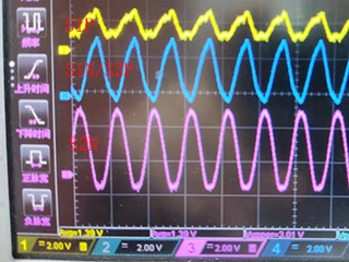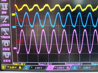 可以看到S1P,S1N/S2P(中心抽头)波形明显失真,但随着LVDT的笔芯移动,S1P,S1N/S2P波形幅度会变大,同时波形也会变成正弦波,到笔芯移动到末端时,S2N和S1P的波形正好交换