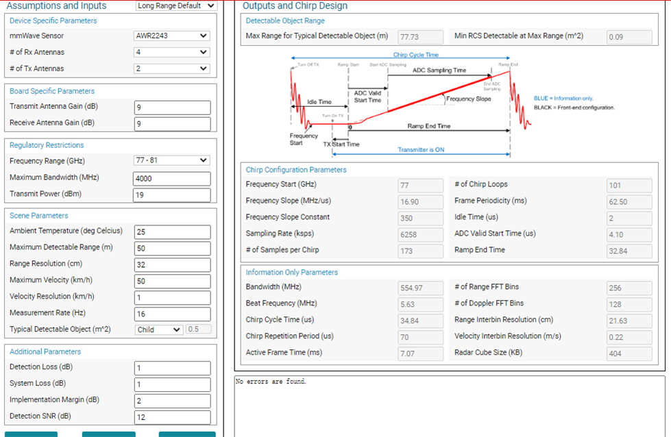 我希望雷达的最大探测距离可以达到50m。并通过mmWaveSensingEstimator生成了50m探测距离的配置。