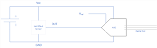 首先,假设此处显示的霍尔效应传感器具有宽 Vcc 电压范围,并且无论 Vcc 电压如何,都具有 2V 的固定输出范围。在这种情况下,最好将 ADC 的 Vref 设置为接近霍尔效应传感器的最大输出电压,以提供最大的分辨率。 由于工艺、温度和电压相关的变化,很难与该基准电压保持一致。 相反,使用系统中已存在的固定基准电压会更容易。 Vcc 是一个简单的备选基准电压,因为它是现成的并且已知大于传感器的输出电压。