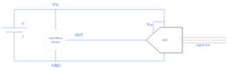 这里的挑战在于 Vcc 通常不是理想的固定电压。 每当出现电源噪声或电池供电系统中的电量耗尽时,都会引入一个新的错误。 即使霍尔效应传感器在可接受的电源电压和静态输入磁场内持续运行,只要 ADC 的基准电压发生变化,最终产生的转换输出代码就会发生变化。 对于读取 ADC 输出的微控制器,代码变化表示与该传感器一起使用的磁体已改变位置。 控制系统中位置数据的错误变化是一个严重的安全性和可靠性问题。