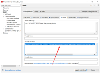 •  这里的内容为${COM_TI_MMWAVE_SDK_INSTALL_DIR}/packages/scripts/ImageCreator/xwr16xx/out2rprc/out2rprc.exe xwr16xx_mmw_dss.xe674 xwr16xx_mmw_dss.bin