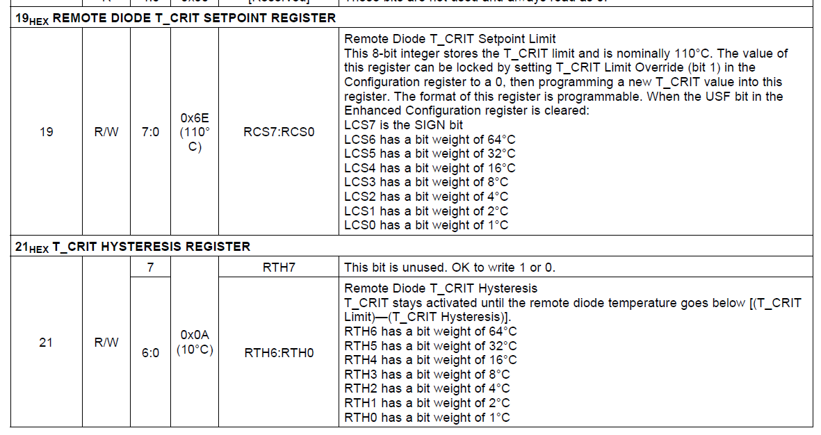 T_CRIT Limit按默认值(110℃),T_CRIT Hysteresis(0x21)设为4c(64℃),按资料描述,当远端温度超过110℃时,T_CRIT 拉低。由于远端实际温度只有50℃,不好模拟超过110°的情况,于是我通过调整0x11、0x12的远端温度偏移寄存器值来模拟远端温度改变,当把温度偏移设为70℃时,从远端温度寄存器读出来的值就超过110℃了,T_CRIT拉低,这个是正常的。但是当温度降低后,按照datasheet里面描述的“T_CRIT stays activated until the remote diode temperature goes below (T_CRIT Limit)—(T_CRIT Hysteresis)].”,他应该等温度降低64℃后才释放T_CRIT的,实测低于110℃后T_CRIT就释放了?还有什么需要注意的地方?