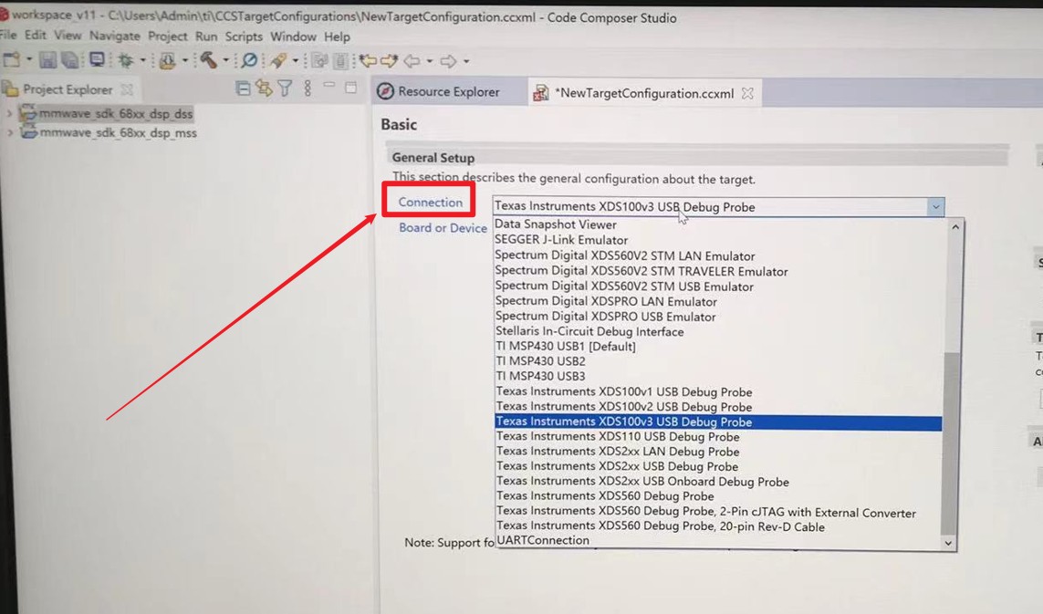 这个connetion是仿真器的意思吗?我如何知道选哪个型号的connetion?有没有文档说明?另外,我只有一块IWR6843ISK-ODS的情况下,用一根 USB-microUSB 的线连接IWR6843和电脑,我该选哪个connetion?