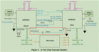 当前我们做了个两片级联的射频板,想搭载TDA2通过Studio做数据采集验证,但是在studio上下载固件时只有master芯片可以正常下载,如下,从芯片的SPI connect没有反应,无法下载固件,我们用示波器测量了下,好像从芯片的时钟信号没有同步过去,如下第二图红色链路,此处主芯片的OSC_CLKOUT没有测量到同步信号输出到从芯片,请问如果通过studio这样去下载固件还需要做其他的一些软件接口的配置使主从两芯片都能正常工作吗?
