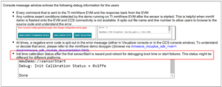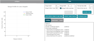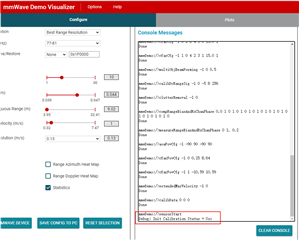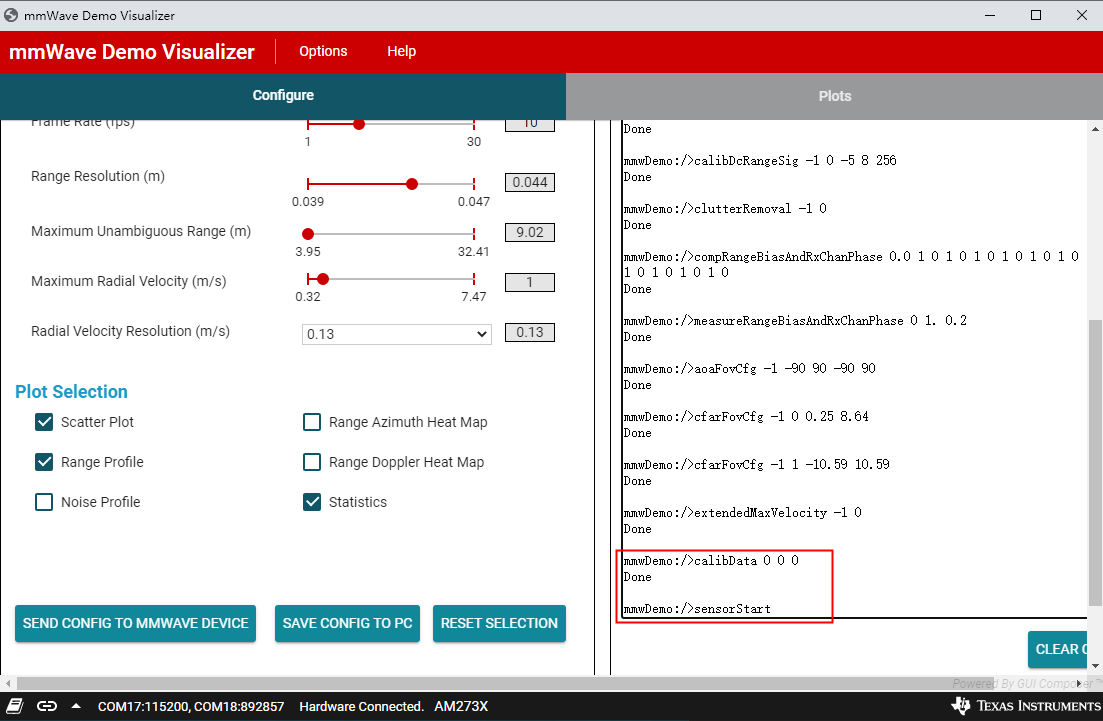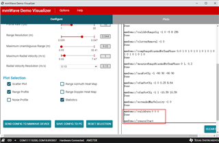 然后编译运行,同样按照AWR2243+AM2732的方法编译固件,刷录,这些都是成功的,如下,刷录完成之后,在visualizer里面串口连接也是成功的,但是通过plots 里面LOAD CONFIG FROM PC AND SEND,下载如profile_2d_am273x.cfg参数配置时,好像没有成功,如下第二图第三图,请问此处AWR2243的参数配置命令和AWR1243有差异吗,有1243的相对应配置命令说明吗(是否跟DFP里面的命令有些差异),除了参数配置外,其他的地方软件是否还需要做修改调整,以使参数配置下载完成,visualizer中目标能实时显示?