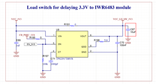 TI的工程师们您好。我最近在使用IWR6843ISK开发板测试其性能。我注意到其原理图上有一个“Load switch for delaying 3.3V to IWR6483 module”部分。在我购买的开发板中R191电阻和TPS22917DBVR芯片都是焊接上的。这意味着这个模块的输入输出被短路了,也就是说这个模块在开发板运行过程中似乎并没有起作用。请问这个模块在开发板上究竟起什么作用?它对于IWR6843正常工作是否是必须的?