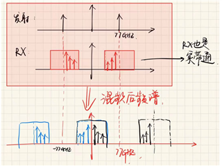 1、请问这个RX回波为什么会集中在比77GHz小的inband里面呢,有什么公式能说明这个问题吗?它这个图里面是实数混频,发射信号是线性调频,接收回来也是线性调频,LO频谱应该是带通信号的频谱吧,另外这个image band又是指什么意思呢?我按照实信号的频谱以及结合他的文章表述画出了如下的频谱图: