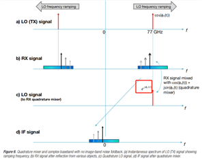 3、对于他文章中使用复基带的描述,请问他直接和本振及90°相位本振混频后,RX信号同样只在77GHz频率以内,而且混频后的信号为什么会变成负的基带信号呢?混频后箭头所指是不是有些问题?