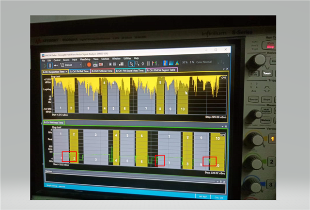 Hi:专家们,我们在使用MMWCAS-DSP-EVM,+4AWR1243P,发现不论怎么配置波形,波形不稳定,发射过程中信号向下掉了。这是怎么回事?