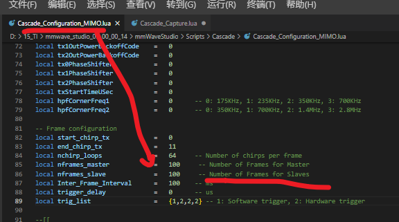 2)将Cascade_Configuration_MIMO.lua脚本中相关的帧配置参数,nframes_master、nframes_slave从默认的10帧修改为100帧,如下图所示;