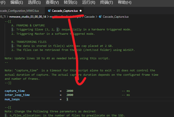 1)将Cascade_Capture.lua脚本中,将capture_time、inter_loop_time从默认的2微秒修改为2000微秒及以上,如下图所示;