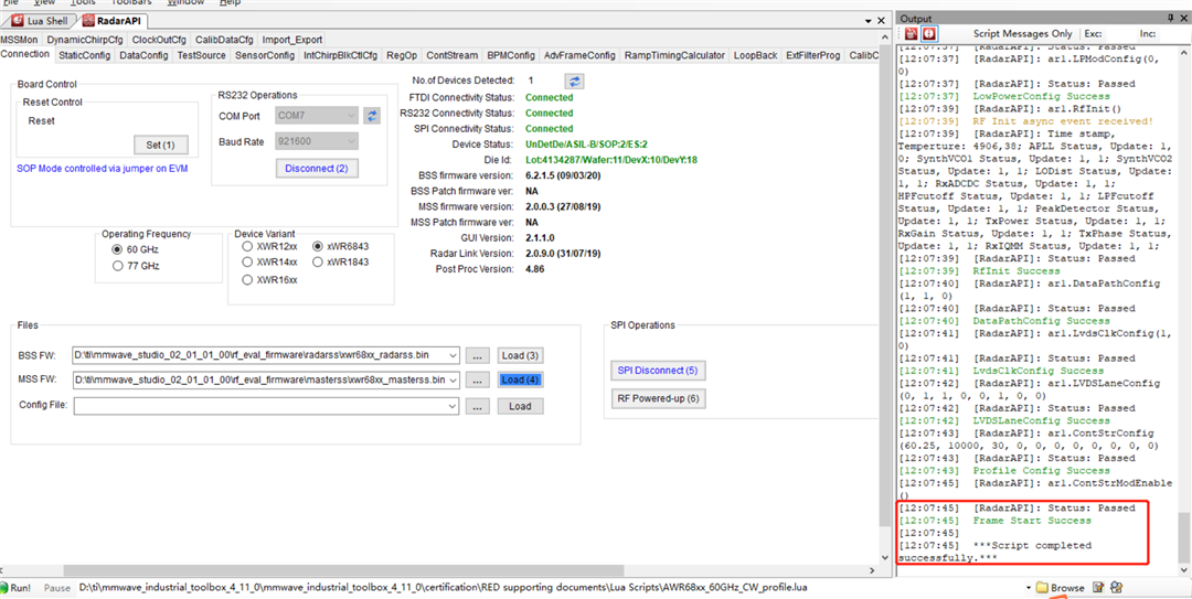 具体如下:下载之后在studio里配置成功,但是不知道如何让雷达进行采集,不确定frame start success是不是已经让雷达开始采集了,但是我没有在ti\mmwave_studio_02_01_01_00\mmWaveStudio\Scripts下找到posproc文件夹。同时\ti\mmwave_studio_02_01_01_00\mmWaveStudio\PostProc下也没有看到新的bin文件生成