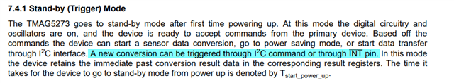 在 Stand-by模式下,可以通过I2C命令或INT引脚触发新的转换,可以通过寄存器TRIGGER_MODE bit 配置,默认是I2C命令触发转换;