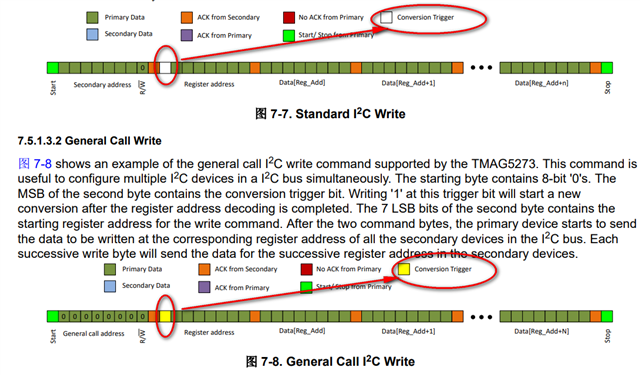 在datasheet 中 7.5.1.3 I 2C Read/Write部分的读写时序图中,如下截图,可以看到在设备地址发送后,ACK应答后,下一个bit就是触发转换: