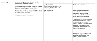 最近在使用awr2944的OOB,我想要通过网口或串口打印出雷达输出的点云信息(X/Y/Z等),发现输出的Z坐标一直是0,我去看了mmwave_mcuplus_sdk_user_guide,里面有一张表格如下图所示,我将channelCfg的第二位