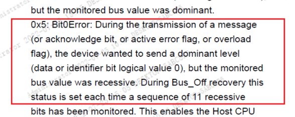 查找参考手册中LastErrorCode的描述,如下所示,节点发送显性电平,总线电平为隐性