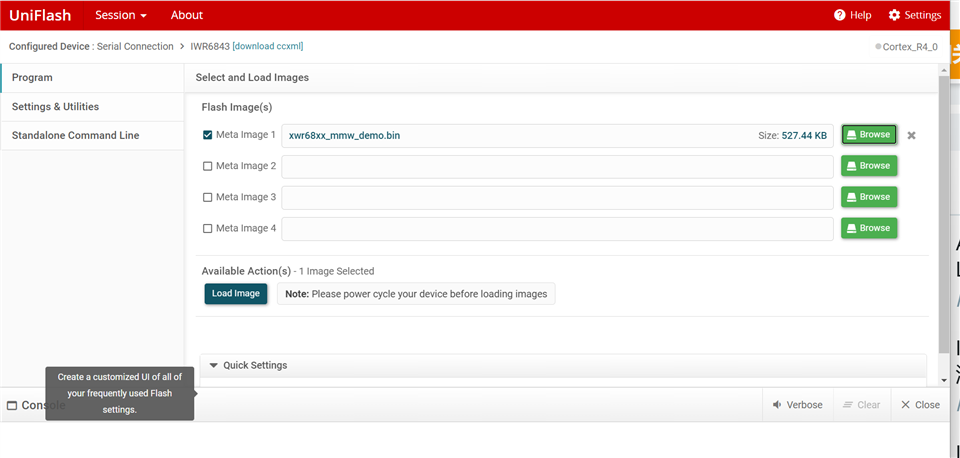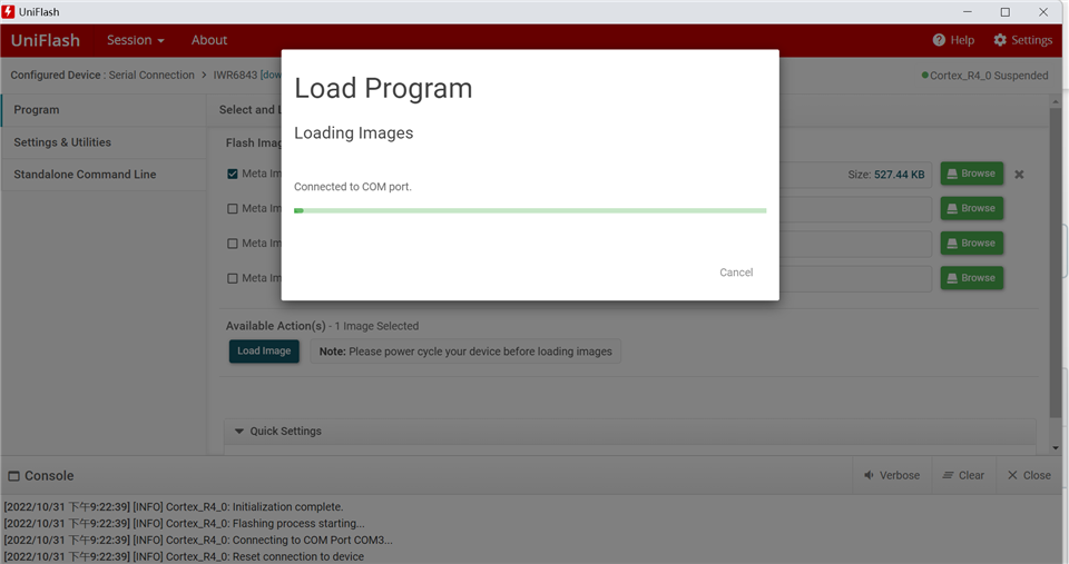 我在使用uniflsh7.1.0烧录IWR6843ISK时,点击load image后一直卡在这个界面