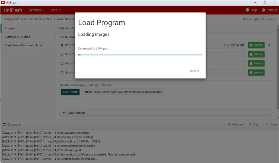 [11/2/2022, 10:21:02 AM] [INFO] Cortex_R4_0: Connection to COM port succeeded. Flashing can proceed.