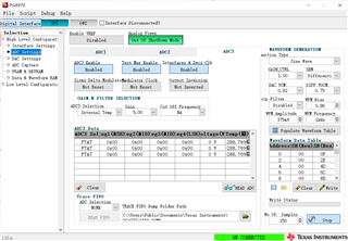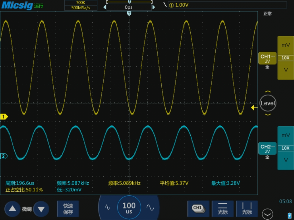 在使用PGA970EVM GUI 时,波形发生器已经可以正常工作,输出波形TP70(P1A)(CH1 黄色)以及经过传感器反馈的输入波形TP27(S1P)(CH2 蓝色)如下: