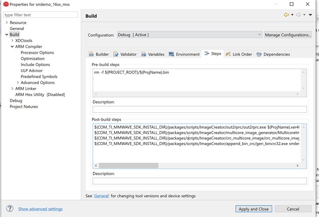 能否直接参考能运行的IWR6843的工程文件里的post build指令添加到您的工程文件里,