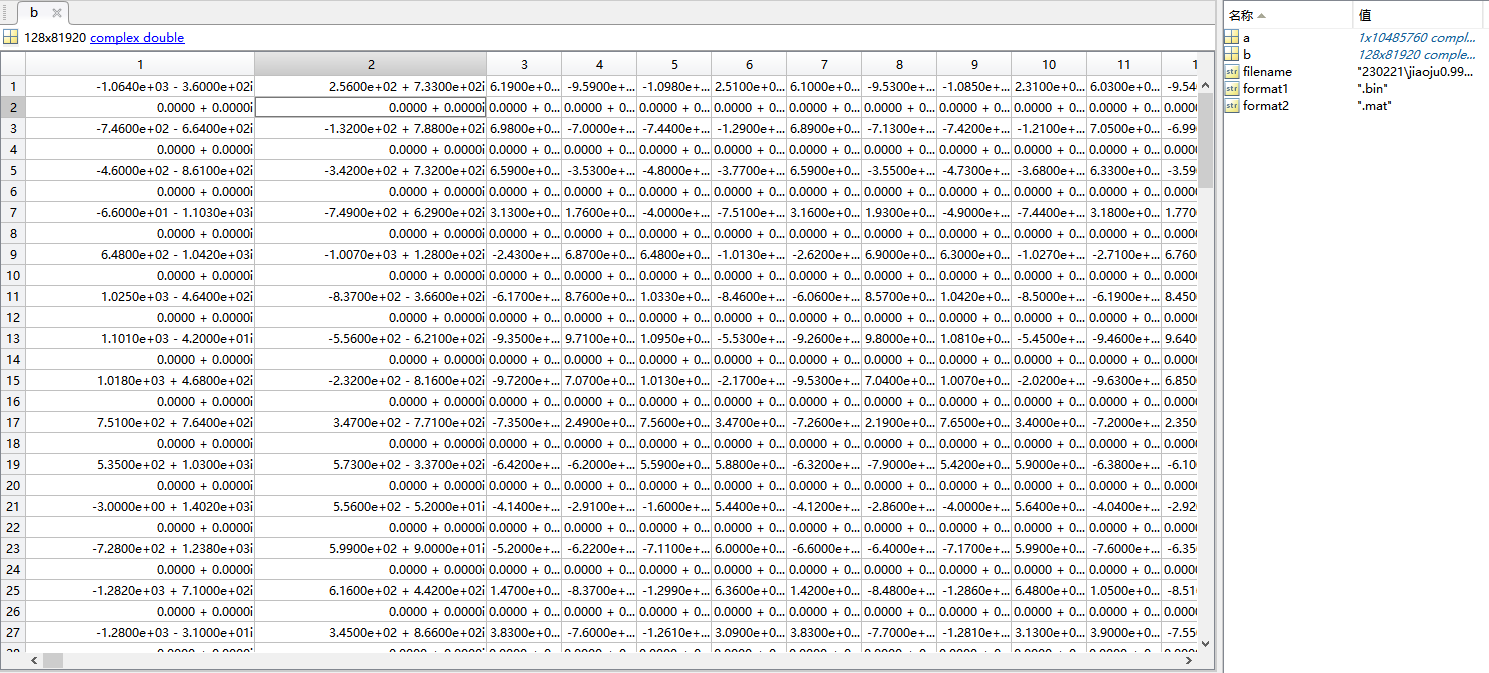 还有请问接收器的IQ的区别是啥?就是一个是实数,一个是虚数吗?那我后面使用数据的时候又需要将实数和虚数合在一起吗?但是我看我采集到的数据的显示其实就是复数的形式,并且会出现一个Chirp的一排数据是有数值,一个Chirp的一排数据是没有数值。然后就是数据量就还是设定值的两倍。如下图所示: