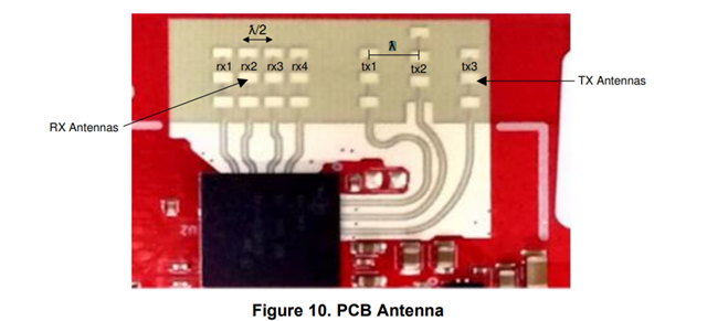 您好,请问IWR1443BOOST中4个接收天线之间的间距和三个发射天线之间的间距是多少呢?
