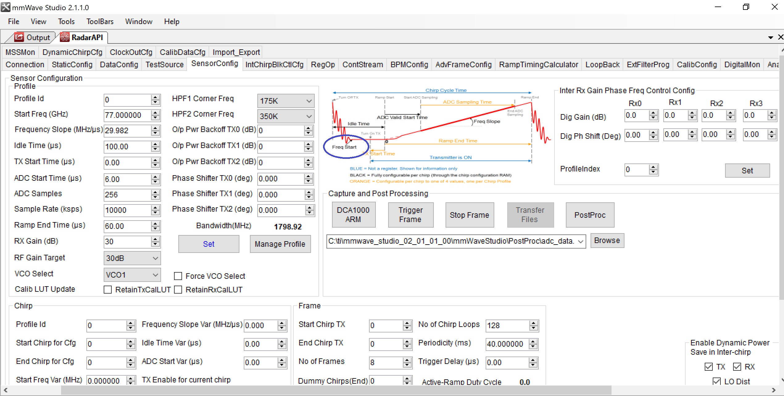 21.4.2 Calculated parameters This is a useful list of parameters that are calculated using the programmed parameters. They include d. True start frequency ramp. The programmed start frequency doesn’t take into account the ADC start time. When the ADC start time is taken into consideration, the true start of the ramp happens a few microseconds after the programmed start.