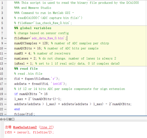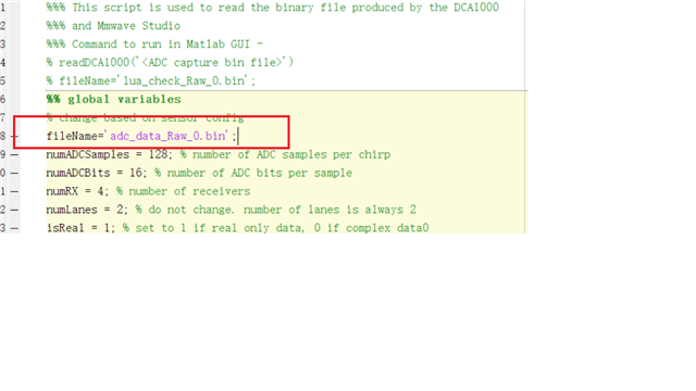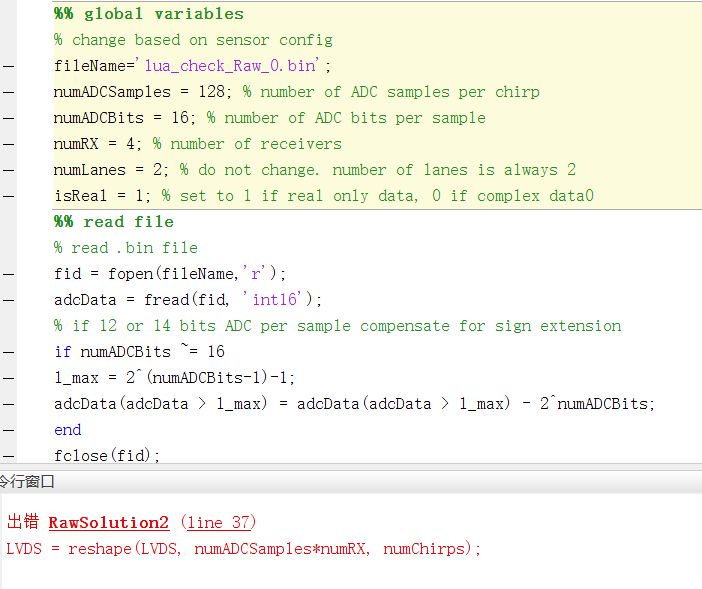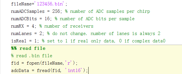 然后使用了Mmwave Radar Device ADC Raw Data Capture中xwr16xx With DCA1000 Data Format一节所提供的matlab代码解析我得到的bin文件。其中一些参数如下: