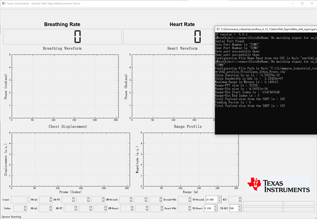 您好,我尝试使用IWR6843ISK的生命体征检测demo,但是在使用VitalSignsRadar_Demo.exe时不能显示数据: