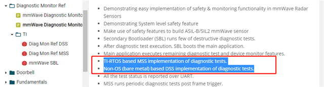 ARM端怎么实现无操作系统的诊断和监控功能,有没有例程可以提供?因为TI-ROTS没有通过功能安全认证,我们需要使用无操作系统NON-OS进行监控和诊断。