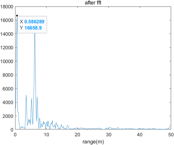 用matlab对收集到的bin文件进行读取,并分别画出了时域图以及频域图,并根据FWCM测距原理将频域图的x坐标转换为了距离。但待测目标的距离在途中所处距离总是比实际距离多出一个定值