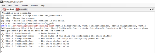 我已知demo里MIMO的方式为时分复用的方法,我在想是否在每个时隙对发送天线的相位进行调整,从而实现发送端的beamforming。但现在的问题是我一方面不知道这款雷达是否支持这种配置,另一方面我也不清楚哪里能够找到相应lua函数接口文档,不清楚应该如何编写对应的lua脚本。