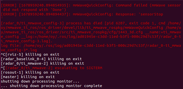 你好,我们利用AWR1443和ROS driver生成点云图会出现 mmWaveQuickConfig: Command failed (mmWave sensor did not respond with 'Done') [ERROR] [1678959240.094894437]: mmWaveQuickConfig: Response: 'sensorStop ' 错误(如图所示),请问该如何解决?