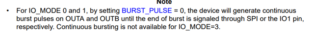 您好,已得到确认:连续突发脉冲只是在IO_MODE = 2下,在 IO_MODE = 0 或 1时是不可行的。