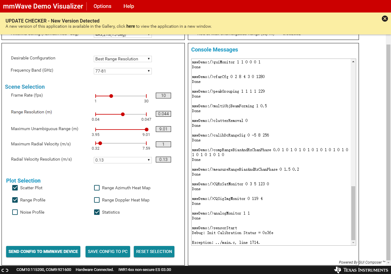 这样的错误就会导致:电脑向 iwr1443 发送一次cfg配置文件(因为开发板并未真正执行sensorStart),无法再次发送cfg配置文件到开发板。  iwr1443开发板无法正常工作。    我在使用实验使用iwr1443,就出现启动一次,后续出现无法发送cfg配置文件的错误。