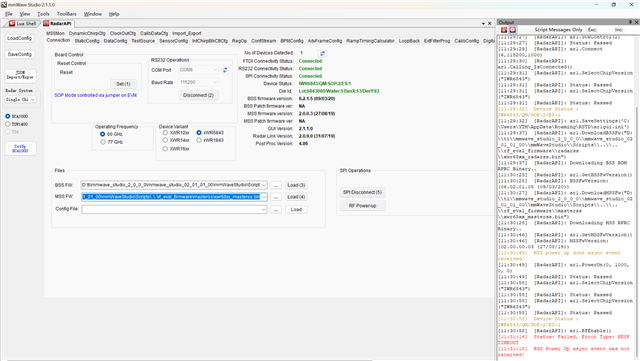 [11:30:27] [RadarAPI]: ar1.DownloadMSSFw("D:\\ti\\mmwave_studio_2_0_0_0\\mmwave_studio_02_01_01_00\\mmWaveStudio\\Scripts\\..\\..\\rf_eval_firmware\\masterss\\xwr68xx_masterss.bin")