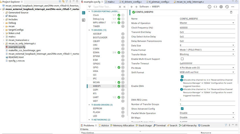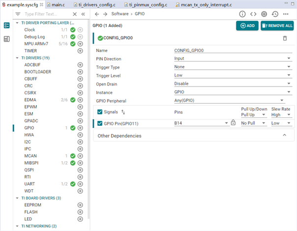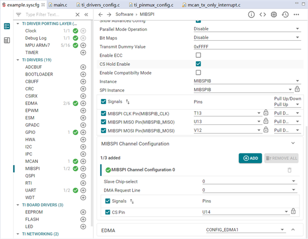 1.我参照RX application中的example.syscfg在TX application中进行了配置,主要是关掉IPC,配置了EDMA、MIBSPI、UART,自己配置了GPIO11。请问这些模块如何配置,有没有参考文件?