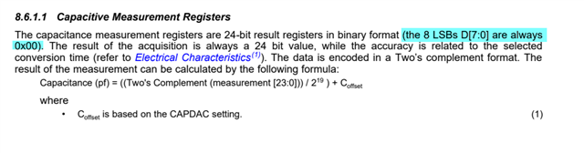 手册上讲FDC1004的测量结果跨越2个寄存器地址,必须要读取两个寄存器才能获得完整的转换结果。,同时,提到测量寄存器是二进制格式的24位结果寄存器,采集结果始终为24位。但是FDC1004不是16位AD吗?采集出来的数据如何存放,如何获得原始AD值数据,而不是转换之后的电容值?