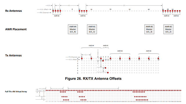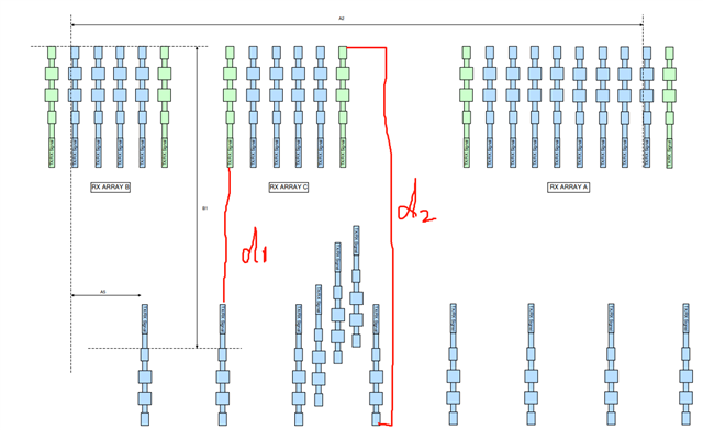 对于上图中的疑问,可以看出该阵列是异构的,我有些不明白这样排列天线阵列的用意,比如说接收天线为什么要分成三个部分排列,中间分别相距4*波长和16*波长的距离有何用意?发射天线里沿纵向伸出的三根天线有何用途,他们之间的间距为什么不同?间距分别是0.5*波长,1*波长,1.5*波长,这其中有什么特殊用意?
