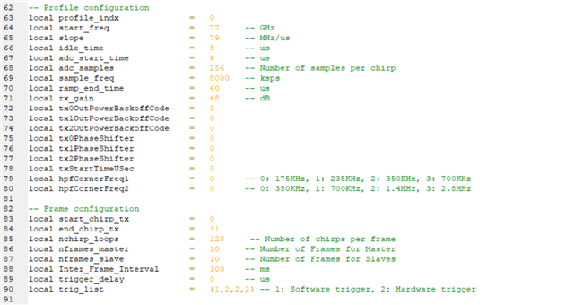 我看和最开始默认的参数相比,SRR模式只是修改了local nchirp_loops = 128 -- Number of chirps per frame这一个参数,最开始默认的是64,之前我修改这个参数测量范围是50米的样子,可是我这几天重新使用的时候,修改参数了测量范围没有变化,这个问题怎么解决呀?