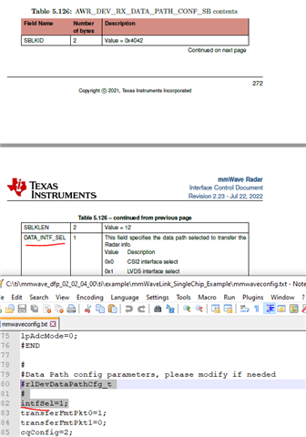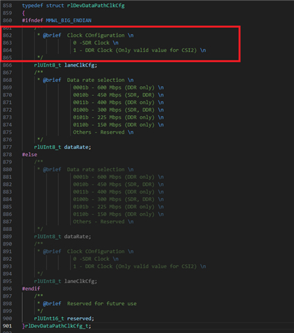 我在进行调试AWR2243单芯片的时候发现关于数据链路配置的结构体中,DDR clock 只能用于CSI2数据接口(如下图1)。但是,在进行数据接口配置的时候,我只配置了 rlDevLvdsLaneCfg_t 结构体(见下图2),并未配置 rlDevCsi2Cfg_t 结构体(见下图3),这样是不是意味着我使能的接口为LVDS接口,而不是CSI接口,此时我使能 laneClkCfg = 1 是无效的。