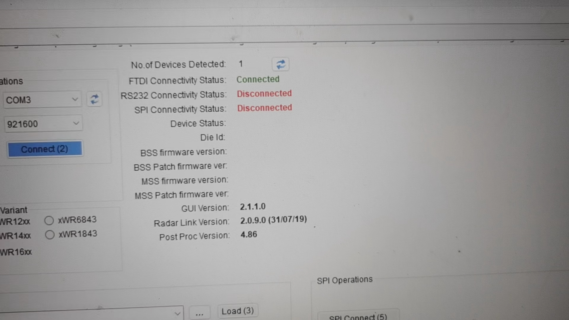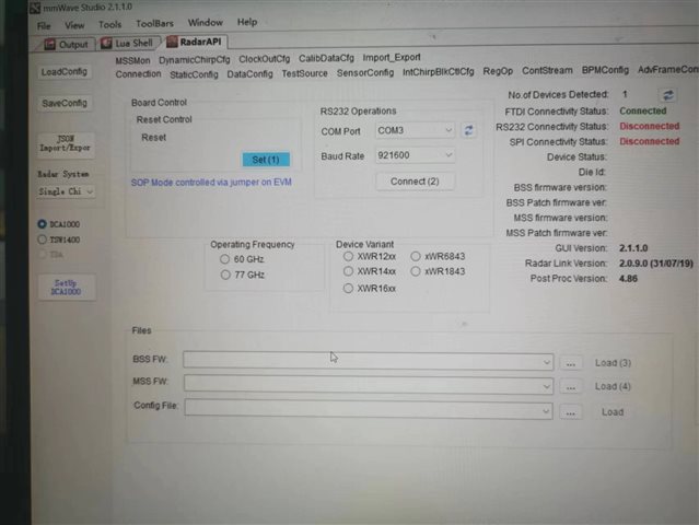4. 软件设置问题:在mmWave Studio中,您可能需要手动设置RS232和SPI的连接参数。请确保您已经正确配置了这些参数,并选择了正确的串口和SPI接口。